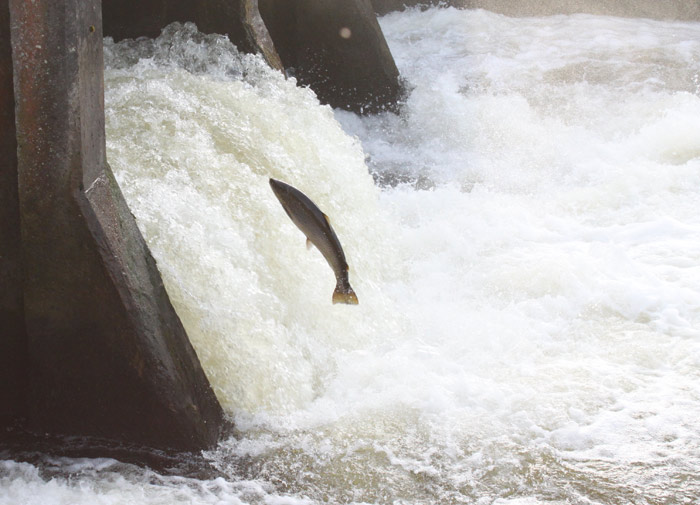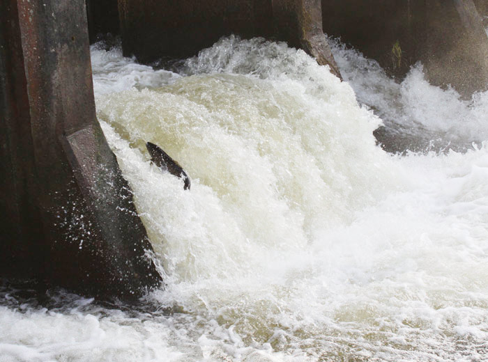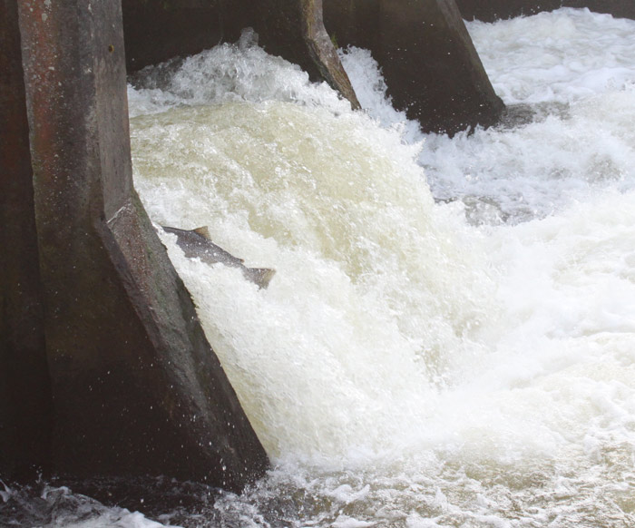 Udokumentowane zdjęciami obserwacje dokonane na jazie w Chocielewku w ostatnich dniach potwierdzają, że tegoroczny ciąg tarłowy troci w rzece Łebie jest intensywny.