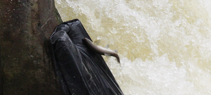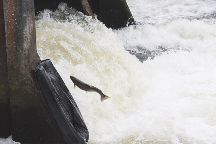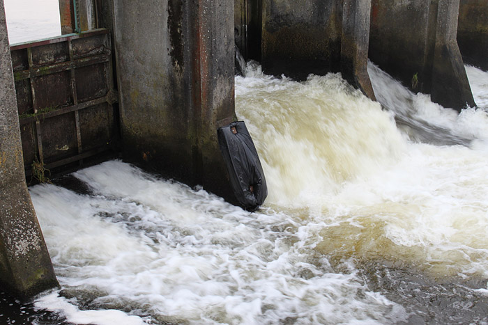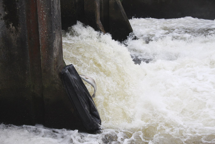 Osłonę założono tam, gdzie uderzała zdecydowana większość troci, którym skok się nie udał- prawie wszystkie próbują pokonać jaz od lewej strony (patrząc w górę rzeki). Podczas ciągu tarłowego część troci wędruje wybudowaną w 2001 roku przez W. Nowickiego własnym kosztem przepławką, część natomiast z rozpędu pokonuje spiętrzenie- jest to możliwe dzięki zainstalowaniu przez niego w prowadnicach jazu dwóch progów z belek drewnianych. Osłona to kolejna cenna inicjatywa, znacząco ułatwiająca rybom życie. O jej przydatności najlepiej świadczą poniższe zdjęcia i film. Jak widać niektóre pożyteczne rozwiązania nie są kosztowne, wystarczy dobra wola i zaangażowanie.