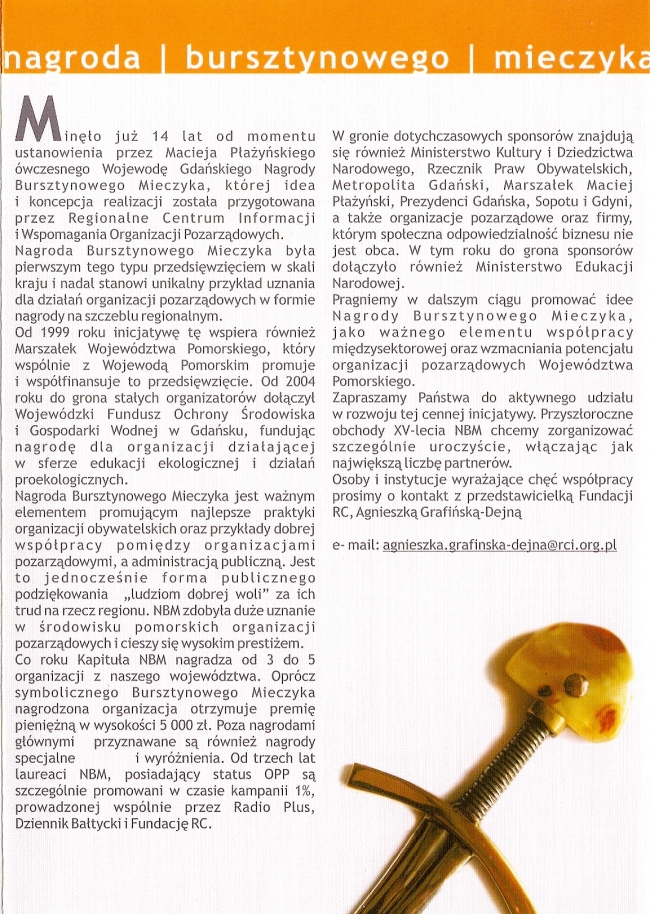 9 grudnia w gdańskim Ratuszu Staromiejskim odbyło się uroczyste wręczenie Nagród i Wyróżnień Bursztynowego Mieczyka, którymi uhonorowano organizacje pozarządowe z województwa pomorskiego podejmujące działania na rzecz promocji nowych rozwiązań oraz aktywnie współpracujące z instytucjami sektora publicznego. Tę prestiżową nagrodę ustanowił 14 lat temu ówczesny Wojewoda Gdański- Maciej Płażyński, w oparciu o ideę i koncepcję realizacji przygotowaną przez Regionalne Centrum Informacji i Wspomagania Inicjatyw Pozarządowych. Decyzją Kapituły Konkursu Wyróżnienie przyznano Towarzystwu Przyjaciół Rzeki Łeby. W tym roku do Kapituły wpłynęło pięćdziesiąt sześć zgłoszeń.