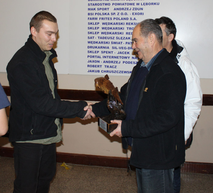 Starosta lęborski Wiktor Tyburski wręcza Adamowi Owsiejko rzeźbioną troć za największą rybę zawodów