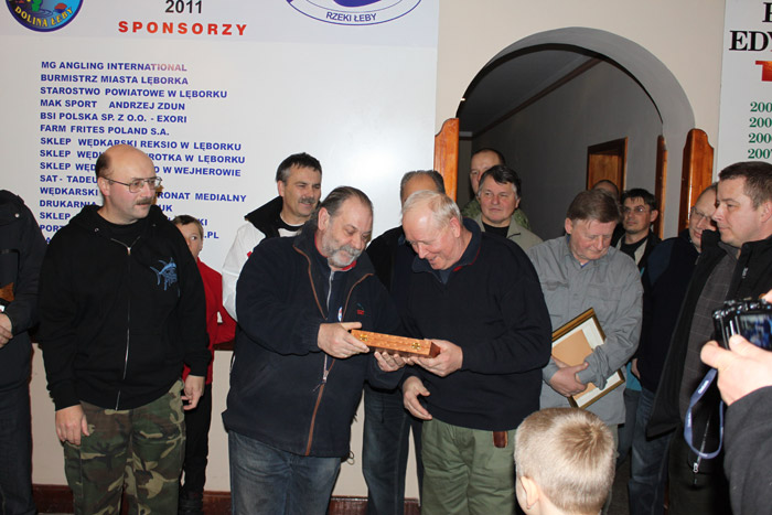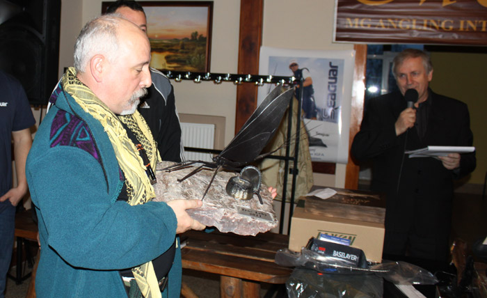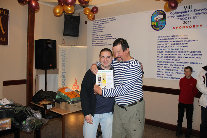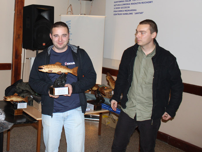 Piotr Tomaszczyk odbiera od prezesa Klubu Muchowego "Dolina Łeby" Andrzeja Adamiaka statuetkę za trzecie miejsce