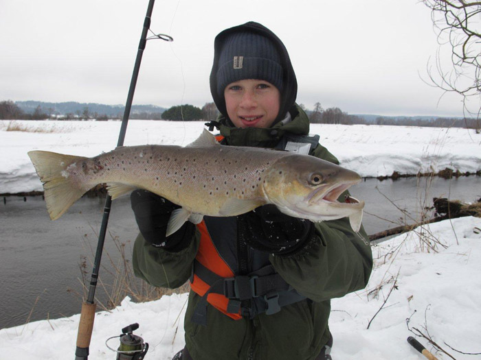 Michał Wojciechowski z trocią 62,3 cm (ryba wypuszczona) fot. M.Kostuch
