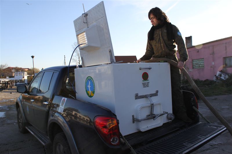 Pracownik SPN odławia ryby z basenu i przenosi je do zbiornika na terenówce