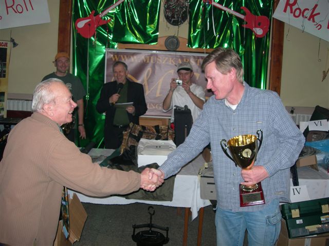 Prezes Towarzystwa Przyjaciół Rzeki Łeby Marian Ślęzak wręcza puchar zwycięzcy zawodów Edmundowi Antropikowi fot K. Lisiecki