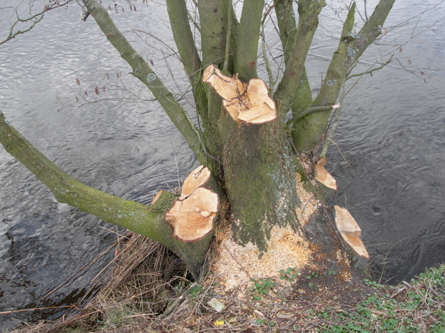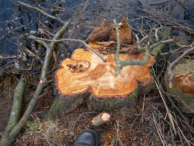 W dniu wczorajszym 17.03 w towarzystwie strażników SSR Koła PZW Lębork-Miasto Bronisława Szablewskiego i Stanisława Fietkiewicza sprawdziliśmy skalę nielegalnej wycinki drzew, jakiej dokonano w gminie Nowa Wieś Lęborska na odcinku od ujścia prawobrzeżnego dopływu Sitnica w rejonie Niebędzina, aż do miejscowości Gęś. Wybraliśmy rejon Niebędzina, wystarczający, by wyrobić sobie zdanie o rozmiarach i metodologii przestępstwa. Na sprawdzonym odcinku stwierdziliśmy liczne wycinki drzew w linii prawego brzegu rzeki Łeby oraz w linii brzegowej przylegających do Łeby starorzeczy. Wycinano głównie olchy i wierzby, czasem- rzadko się trafiający- czarny bez.