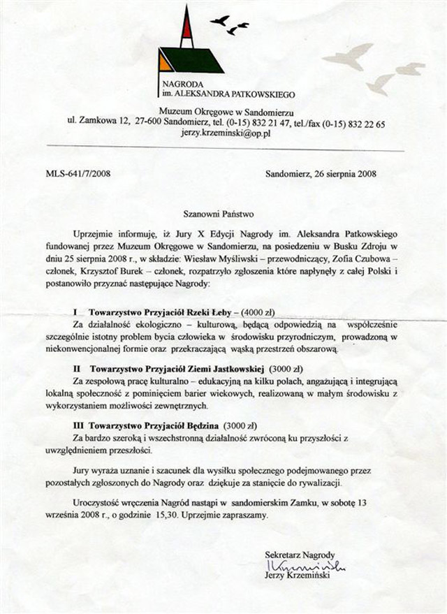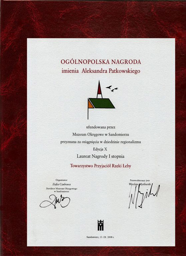 Po oficjalnym powitaniu gości w galerii zamkowej przez organizatorów konkursu , Janina Paradowska wystąpiła z wykładem wprowadzającym i poprzedzającym dyskusję nt. „Polak obywatel. Stan obecny i diagnozy”. W godzinę później rozpoczęła się najważniejsza ceremonia. Po odczytaniu werdyktu Jury, jego przewodniczący, znakomity i uznany pisarz Wiesław Myśliwski, dokonał wręczenia Nagród, które są najważniejszymi w tej kategorii w kraju. Nagrodę główną- I stopnia (medal i 4000 zł) otrzymało Towarzystwo Przyjaciół Rzeki Łeby. Dwie Nagrody II stopnia wręczono Towarzystwu Przyjaciół Ziemi Jastkowskiej i Towarzystwu Przyjaciół Będzina (medale i po 3000 zł). Laureaci wszystkich edycji uhonorowani zostali również „krzemienną szpilą przyjaźni” inkrustowaną sandomierskim krzemieniem pasiastym. W krótkich wystąpieniach nagrodzeni zaprezentowali działania i dokonania swoich stowarzyszeń. O godzinie 18.00 rozpoczął się w Sali Rycerskiej Koncert Zespołu Il Canto Minore z „Melodiami na Psałterz Polski” Mikołaja Gomółki. Po koncercie odbyło się spotkanie z udziałem laureatów i gości X Edycji Nagrody. Nagrodę im. Aleksandra Patkowskiego zainicjowało Muzeum Okręgowe w Sandomierzu w 1998 r. nawiązując do działalności twórcy regionalizmu Aleksandra Patkowskiego (1890-1942), jednej z najpiękniejszych postaci w dziejach Sandomierza. W opublikowanym w 1924 r. tekście programowym „Idee przewodnie regionalizmu” pisał Patkowski: „Regionalizm wysuwa hasło wzmożenia przynależności terytorialnych, przez podejmowanie zbiorowego wysiłku ugrupowań, osiadłych na danym terytorium, hasło organizacji pracy, koordynowania inicjatywy, twórczego i aktywnego stosunku wobec zjawisk zachodzących w najbliższym otoczeniu. Przez wszechstronne poznanie ziemi i człowieka regionalizm budzić ma zmysł organizacyjny, dar inicjatywy, umacniać dyscyplinę egzekutywy, szerzyć zamiłowanie do konstrukcji i konkretności, wykrzesać słowem energię narodową, umocnić ją wolą ciągłości i konsekwencji czynu.” Ideę przyznawanej w formie konkursu nagrody tak określiła Pani Zofia Czubowa- dyrektor Muzeum Okręgowego w Sandomierzu: „Przyznając rokrocznie nagrodę chcemy przypominać dzieło Aleksandra Patkowskiego i upowszechniać uprawiany przez niego model działalności publicznej, opartej na myśleniu patriotycznym oraz obywatelskim”. Uhonorowanie 10-letniej działalności TPRŁ dostrzeżonej i docenionej z odległej perspektywy Sandomierza jest dla naszej organizacji pożytku publicznego wyjątkowym zaszczytem. Towarzystwo reprezentował w Sandomierzu wiceprezes Zygmunt Lisiecki. Organizatorzy Nagrody im. Aleksandra Patkowskiego: Dyrektor Zofia Czubowa Muzeum Okręgowe w Sandomierzu