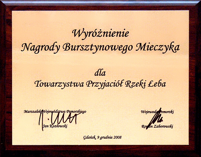 9 grudnia w gdańskim Ratuszu Staromiejskim odbyło się uroczyste wręczenie Nagród i Wyróżnień Bursztynowego Mieczyka, którymi uhonorowano organizacje pozarządowe z województwa pomorskiego podejmujące działania na rzecz promocji nowych rozwiązań oraz aktywnie współpracujące z instytucjami sektora publicznego. Tę prestiżową nagrodę ustanowił 14 lat temu ówczesny Wojewoda Gdański- Maciej Płażyński, w oparciu o ideę i koncepcję realizacji przygotowaną przez Regionalne Centrum Informacji i Wspomagania Inicjatyw Pozarządowych. Decyzją Kapituły Konkursu Wyróżnienie przyznano Towarzystwu Przyjaciół Rzeki Łeby. W tym roku do Kapituły wpłynęło pięćdziesiąt sześć zgłoszeń.