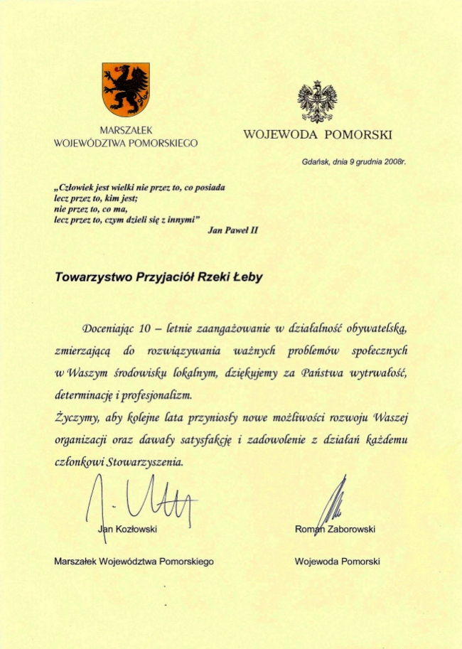 W pięknej gali udział wzięli m.in. Marszałek Senatu Bogdan Borusewicz i Wojewoda Pomorski Roman Zaborowski, który docenił znaczenie organizacji pozarządowych, podkreślając, że każdy kto w nich pracuje godny jest nagrody. TPRŁ reprezentowali prezes Zarządu- Marian Ślęzak i Eugeniusz Cherek. Miłym akcentem było sygnowane przez Marszałka Województwa Pomorskiego Jana Kozłowskiego i Wojewodę Pomorskiego Romana Zaborowskiego pismo gratulacyjne z okazji 10-letniego zaangażowania TPRŁ w działalność obywatelską.