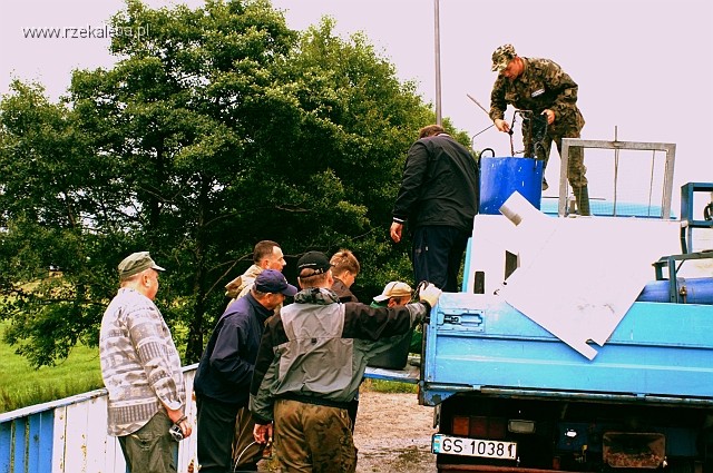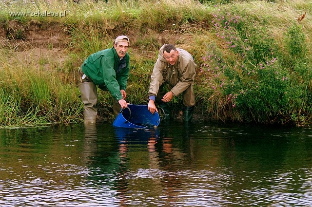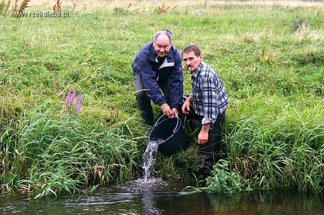 Stowarzyszenia Polskich Producentów i Importerów Sprzętu Wędkarskiego z siedzibą przy ul.Kujawskiej 4, 60-618 Poznań. Pozostały 1000 szt. przekazał Pan Jan Łabędzki. Łącznie do rzeki Łeby wpuszczono około 240 kg pstrągów o wielkości około 15cm. Efekty zarybienia będzie można odczuć wędkarsko dopiero kiedy przekroczą one wymiar ochronny.
